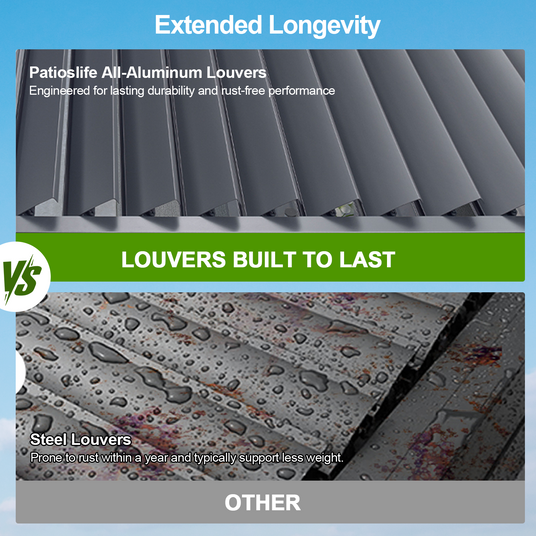 Unlike common pergolas that use steel or mixed materials prone to rust and wear, Patioslife pergolas are built with premium all-aluminum louvers. This design ensures lasting durability, complete rust resistance, and low maintenance even in harsh outdoor environments. With superior strength and weather resilience, our louvers are engineered to look and perform like new for years to come — giving you peace of mind and long-term value.